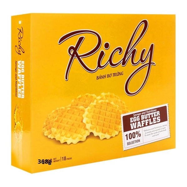 Bánh bơ trứng Richy 368g có thành phần chính là trứng gà và bơ sữa, hòa quyện tạo thành những chiếc bánh thơm dịu, vị ngọt nhẹ nhàng không quá gắt, không dễ ngấy. Đặc biệt, Bánh bơ trứng Richy 368g còn sở hữu hình dáng độc đáo, lạ mắt và ấn tượng (dạng tròn, có đường kẻ caro trên mặt bánh), là điểm nhấn khác biệt trong thế giới bánh ngọt hiện nay.