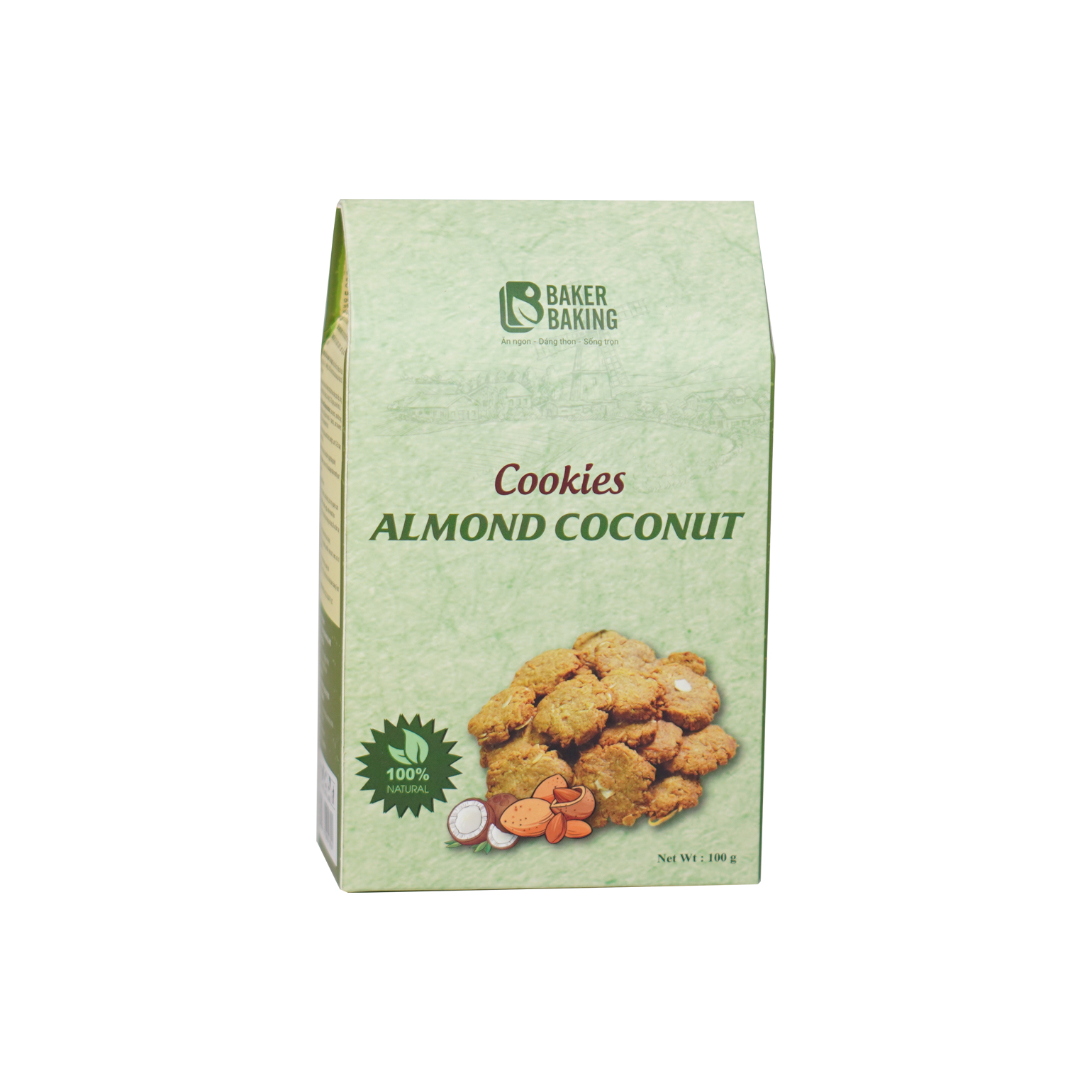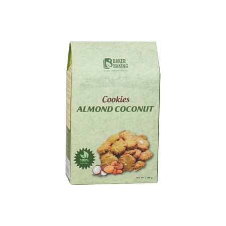 Cookies Vị Hạnh Nhân + Dừa có thành phần chính là: yến mạch, dầu dừa, hạt bí Ấn Độ, nho kho, chocolate chip, hạch nhân, trứng gà, bơ lạc, bột mì nguyên cám, bột quế.