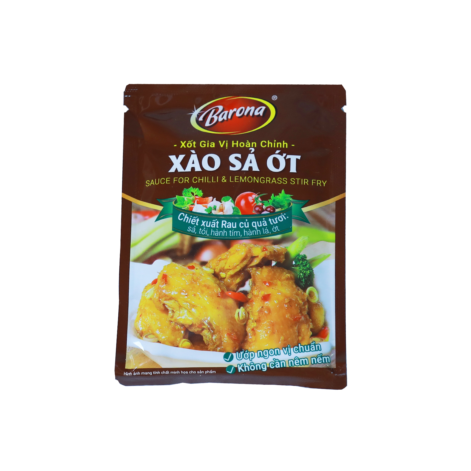 Sốt Gia vị hoàn chỉnh Barona cho món xào sả ớt được pha trộn từ rau củ quả tươi như gừng, tỏi, hành, me… cùng kết hợp với các gia vị khác đem đến món ngon chuẩn vị không cần nêm nếm thêm nhiều gia vị khác.